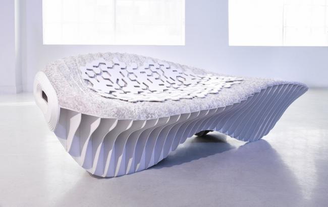 是否想過(guò)你的家具是由堆肥組層的?這個(gè)問(wèn)題的提出伴隨著一系列有關(guān)生物制造長(zhǎng)椅的研究。 Terreform ONE和Genspace公司聯(lián)手開(kāi)發(fā)了兩張生物塑料椅。生成的兩把椅子采用了類(lèi)似的過(guò)程:一把由白色肋骨構(gòu)成的參數(shù)化外形的躺椅,椅子上加了柔軟的墊子。另一把是兒童椅,它將分段的各部分內(nèi)部連接起來(lái),這樣的方式可以讓使用者根據(jù)需要改變其形狀。