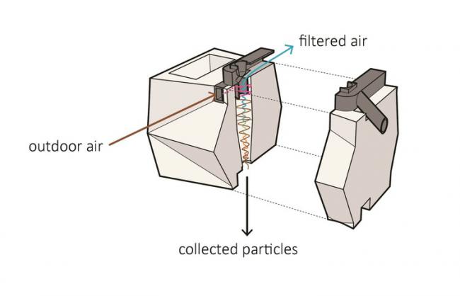 會(huì)呼吸的磚將被用于建筑正常通風(fēng)系統(tǒng)的一部分, 它是一種雙層磚結(jié)構(gòu),外部精制磚輔以可提供標(biāo)準(zhǔn)絕緣的內(nèi)層結(jié)構(gòu)。呼吸磚的設(shè)計(jì)概念是旋風(fēng)過(guò)濾, 一個(gè)來(lái)自現(xiàn)代真空吸塵器的理念。